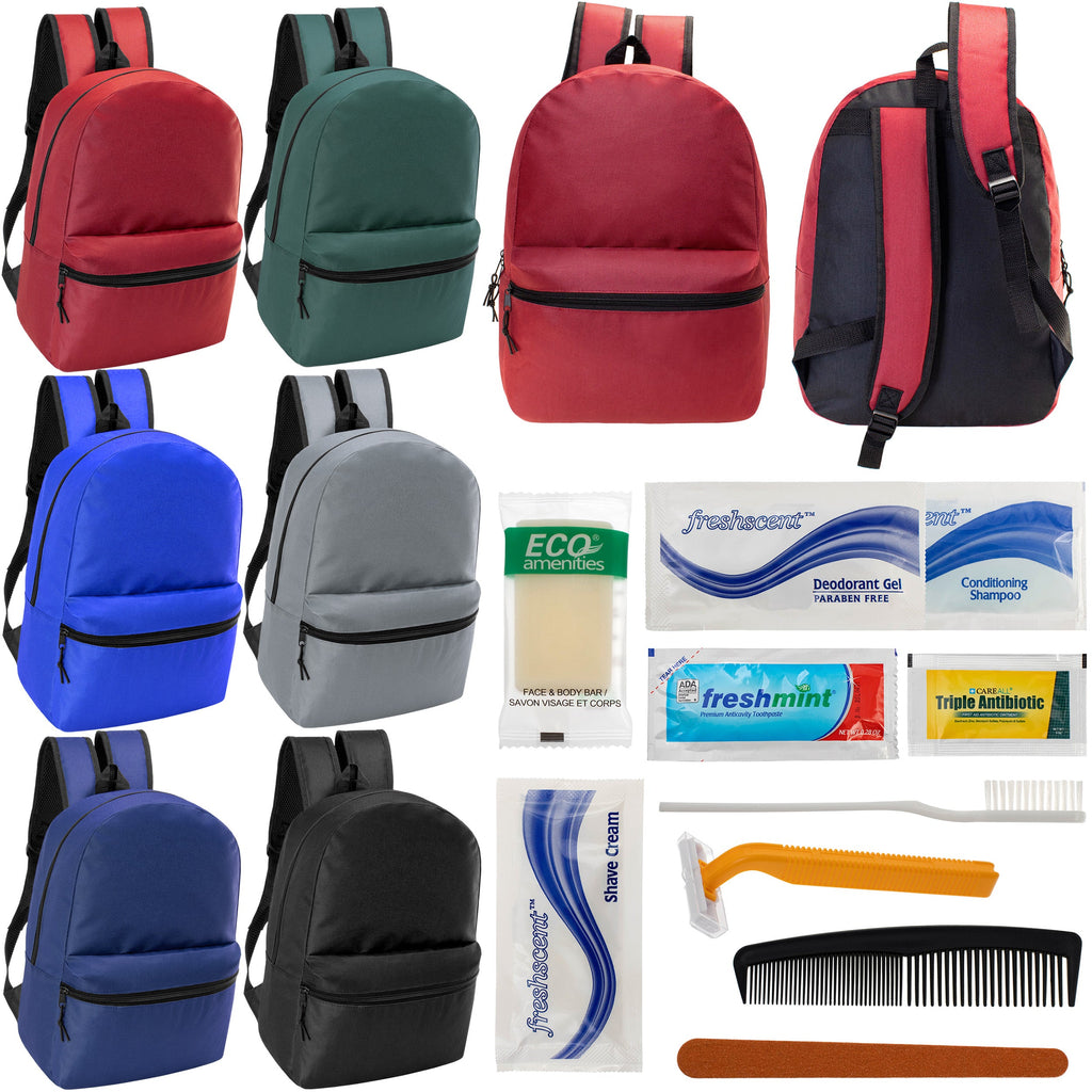 This essential bulk care package for the homeless community combines wholesale hygiene kits of your choice along with our 17 inch basic 19 inch wholesale backpacks. The spacious bulk backpacks come in 12 different colors and features a large main compartment and front pocket along with reinforced, padded and adjustable straps. There are 15 different choice of wholesale hygiene kits to choose from so you can find the one that fits your needs the best. All orders come with free shipping and tiered discount pricing!
