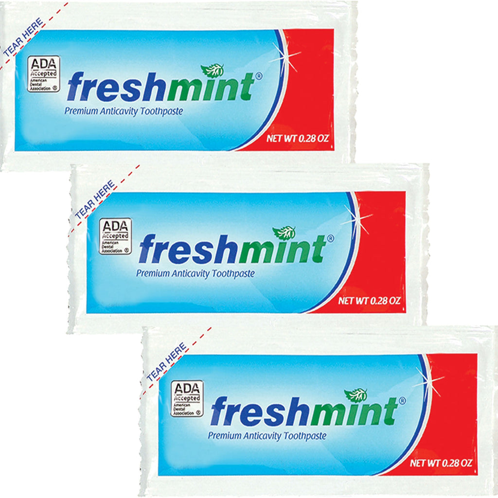 Our wholesale toothpaste packets are a perfect toiletry choice for travel, rentals or for homeless care. Each individual toothpaste packet is .28 ounces in weight and is anti-cavity with fluoride. This mint flavored toothpaste come with bulk discount pricing and free shipping.