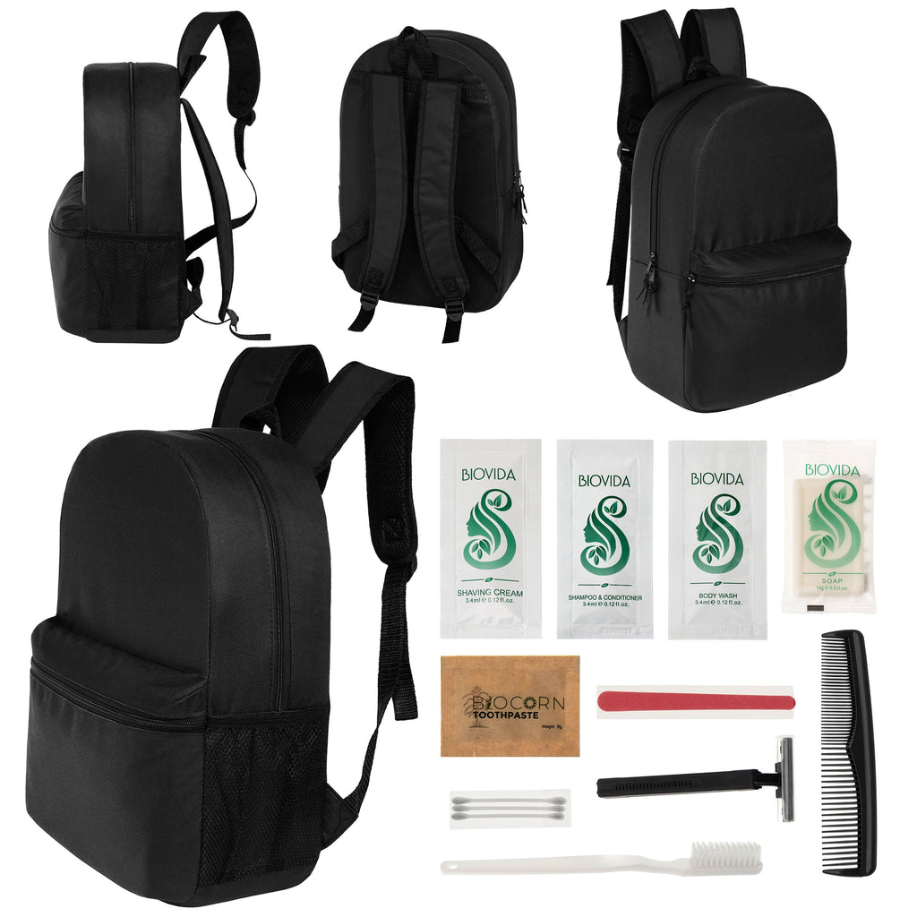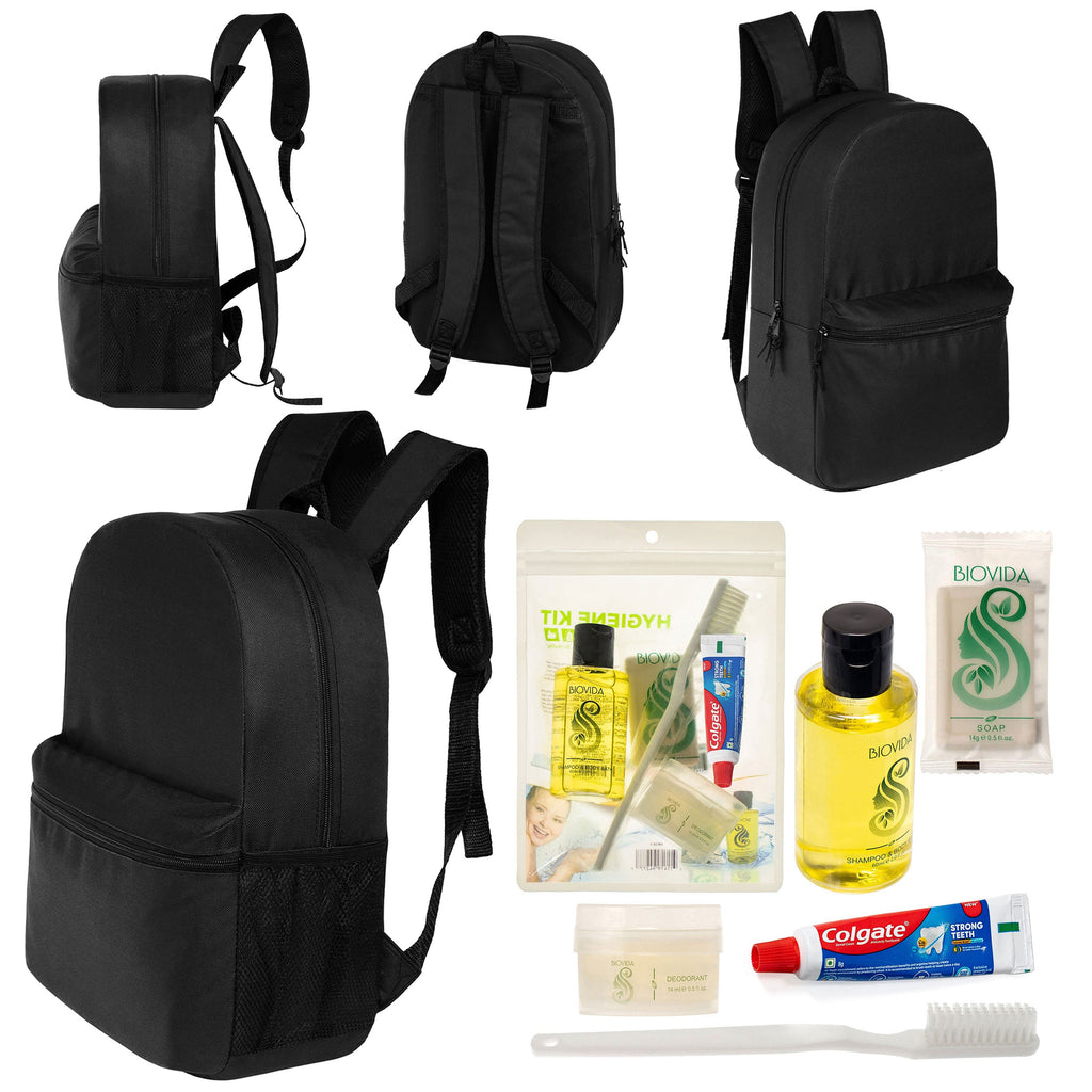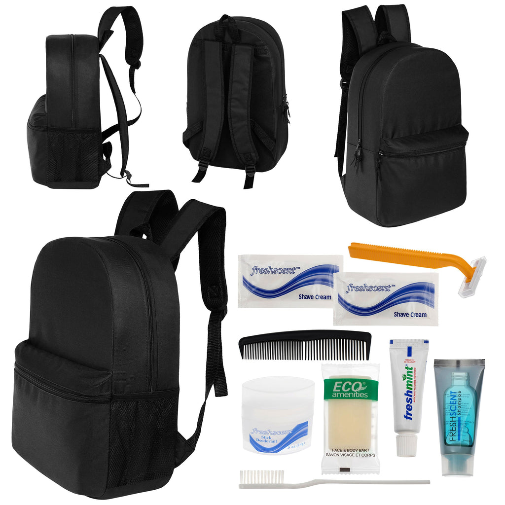 This essential bulk care package for the homeless community combines wholesale hygiene supplies along with our 17 inch basic 19 inch wholesale backpacks. The roomy bulk backpacks come in black and features a mesh side pocket, large main compartment and front pocket along with reinforced, padded and adjustable straps. There are many different choices of wholesale hygiene kits to choose from so you can find the one that fits your needs the best. All orders come with free shipping and tiered discount pricing!