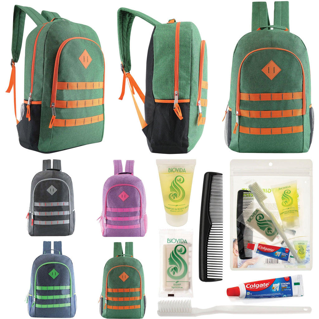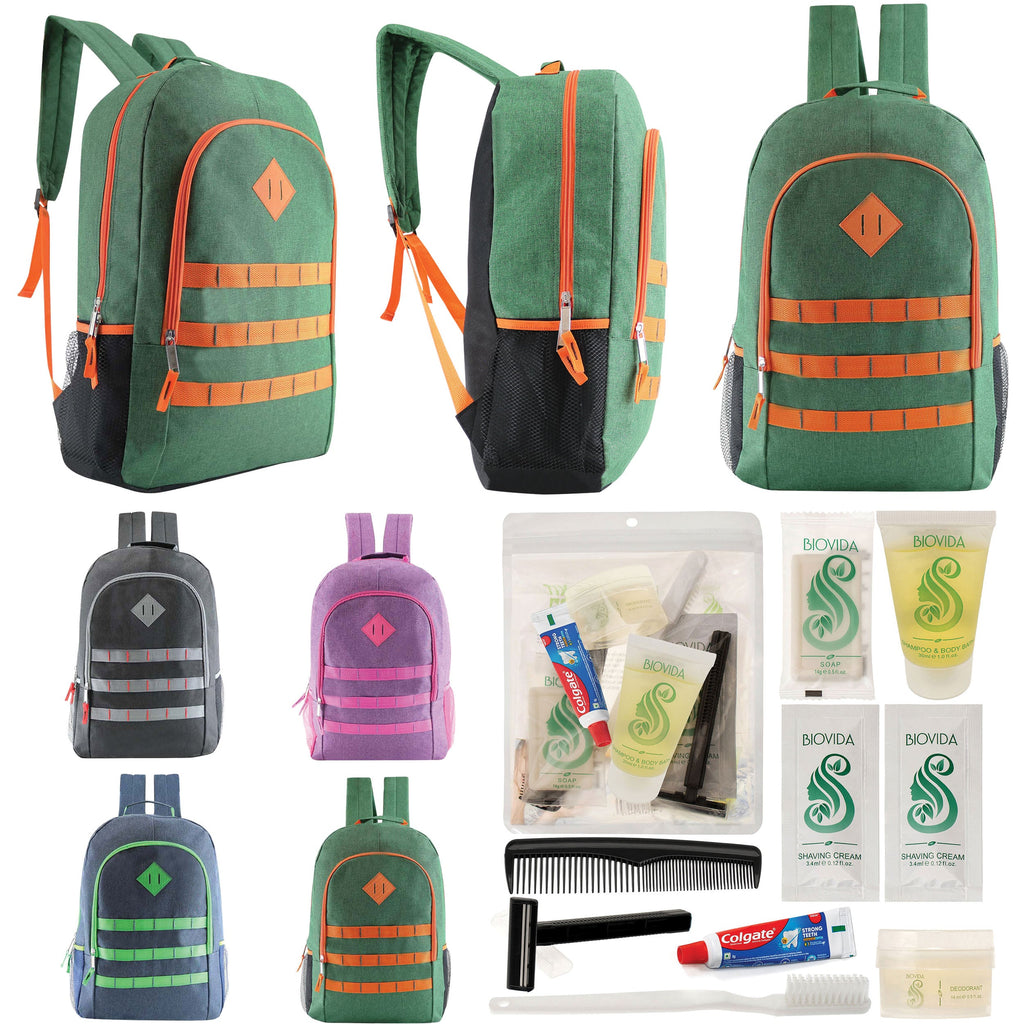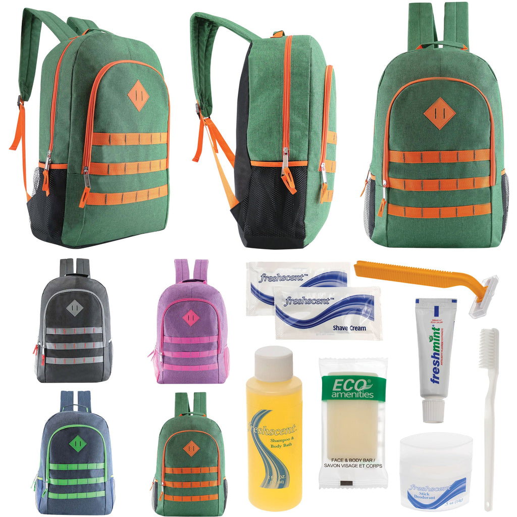 This combo pack includes 12 of our premium 19 inch backpacks that features 2 mesh side pockets and 12 bulk hygiene kits. There are many different kits that have various essential hygiene items that are perfect for homeless care donations and giveaways. Perfect for emergency situations as well, these wholesale care packages come with free shipping and bulk discount pricing.
