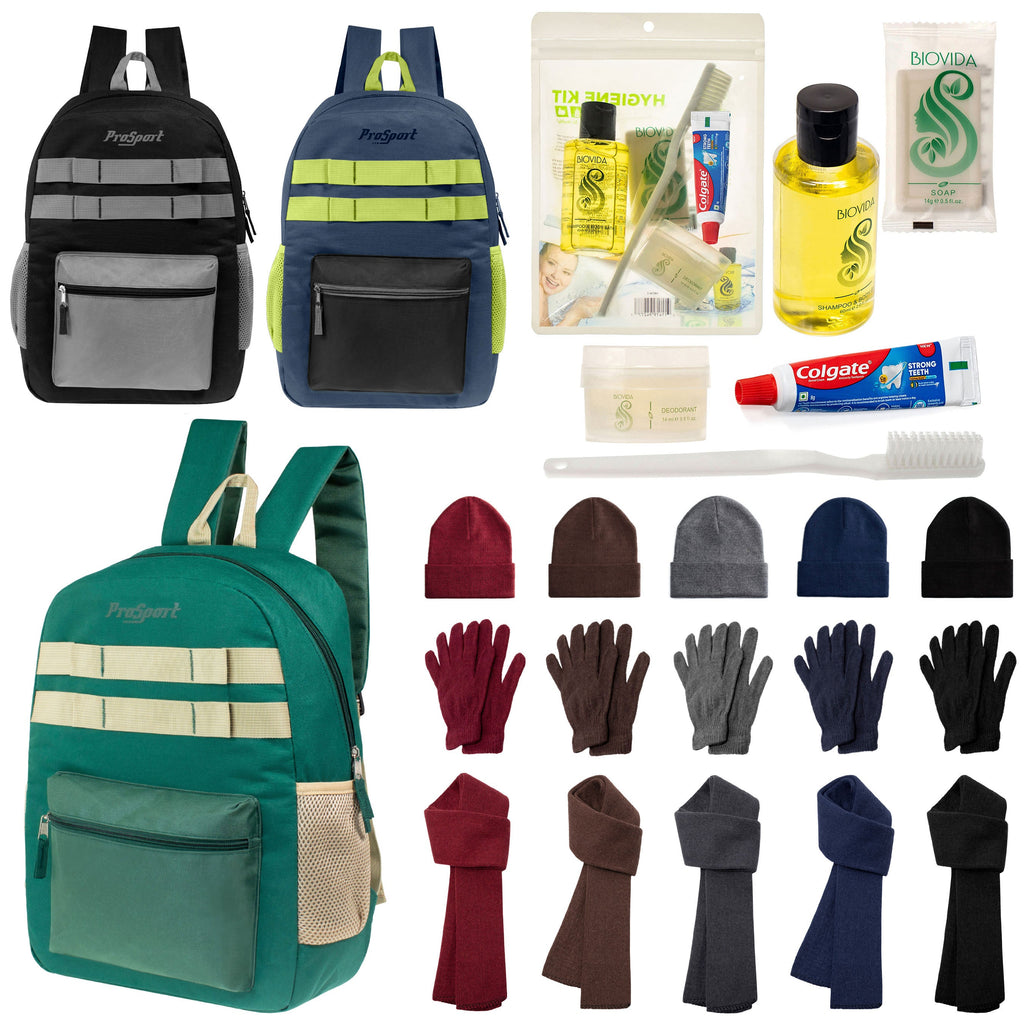 Perfect for the cold winter months, this wholesale care box is a great item for the homeless as it combines our durable 17" backpacks with bulk hygiene kits and winter items including gloves, beanies and scarves. The solid color 17 inch wholesale backpacks are offset with accent trim in 3 assorted multi colors and features padded and adjustable straps and dual mesh side pockets. There are 15 different choice of bulk hygiene kits to choose from so you can find the one that fits your needs the best. All orders come with free shipping and tiered discount pricing!