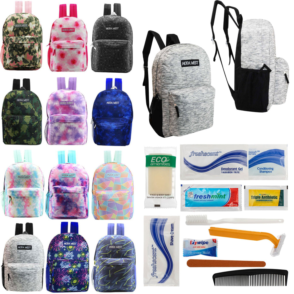 Wholesale care packages are great for the homeless community. This care box combines our popular 17" backpacks in assorted patterns featuring a mesh side pocket with bulk hygiene kits. Our bulk hygiene supplies come in pre-packaged kits so you can choose the one that fits your needs the best. All orders come with free shipping and tiered discount pricing!
