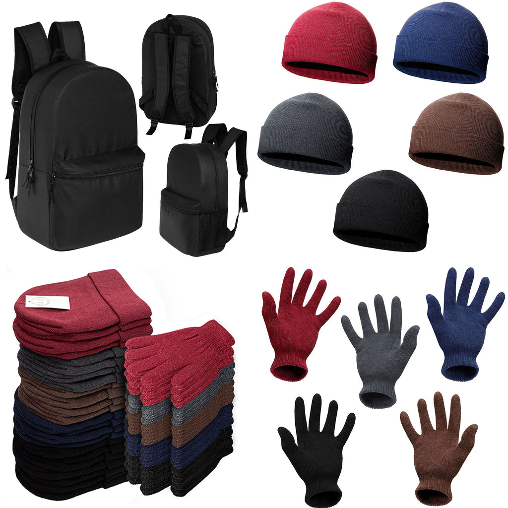 12 Wholesale 18.5" Basic Backpacks in Black & Your Choice of 12 Winter Item Sets - Wholesale Care Package: Homeless, Emergency, Charity