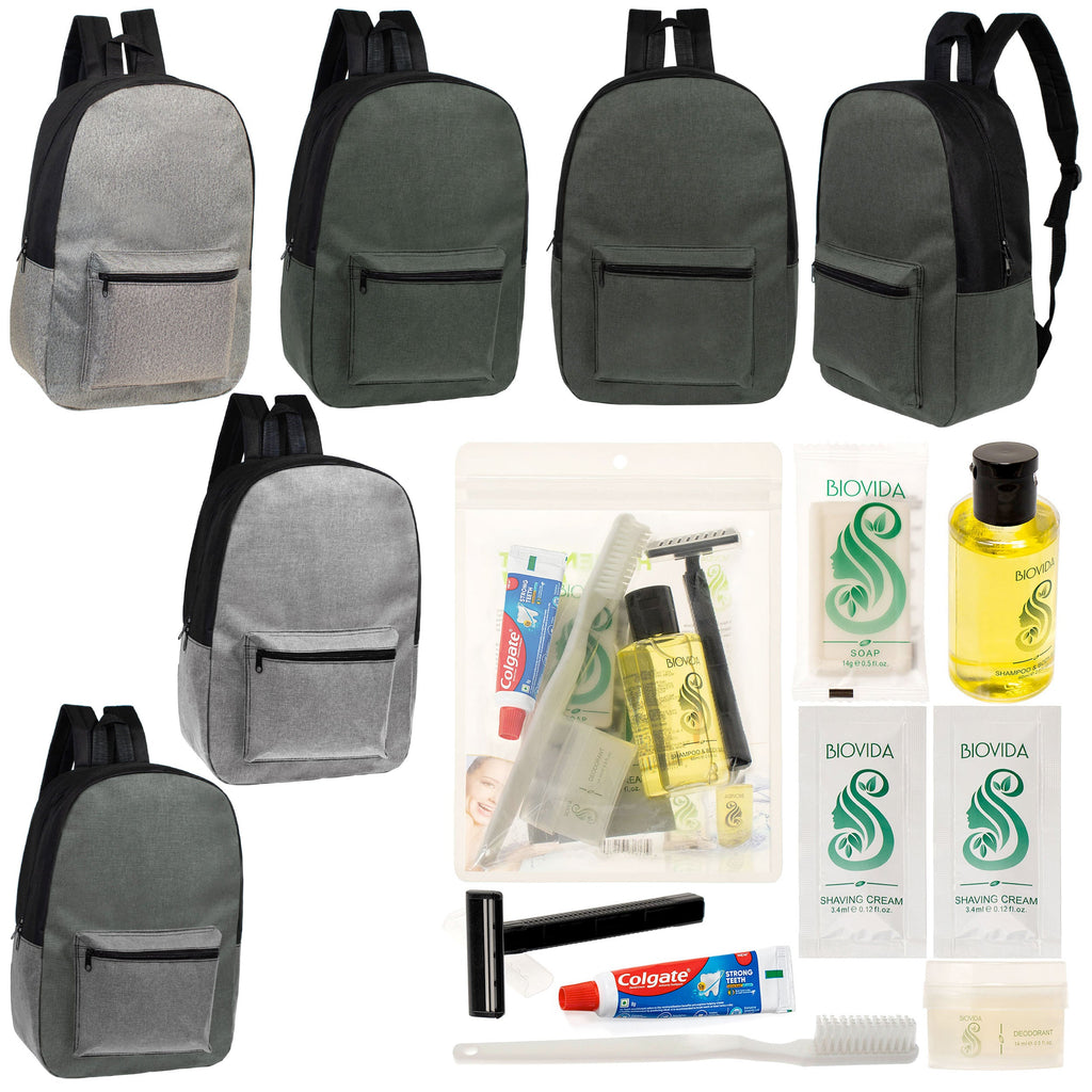 You get 12 wholesale hygiene kits of your choice along with our 17 inch unisex bulk backpacks in 4 assorted colors. Great price on this essential wholesale care box in bulk for the homeless. The sturdy wholesale backpacks features padded adjustable straps and a large main compartment and front pocket. There are 15 different choice of wholesale hygiene kits to choose from so you can find the one that fits your needs the best. All orders come with free shipping and tiered discount pricing!