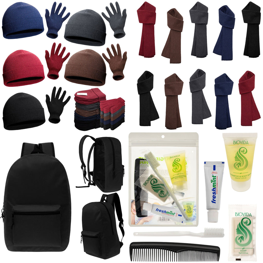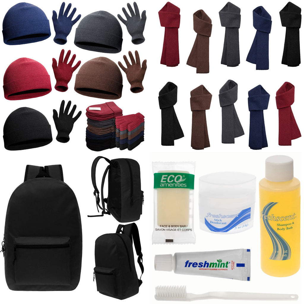 Get 12 basic black 17 inch backpacks along with 12 pairs of gloves, 12 hats, 12 scarves and 12 hygiene kits of your choice in this wholesale care box that is ideal for the homeless. The black backpack features a large main compartment along with a front pocket. Enjoy free shipping and bulk discount pricing on this care package for the homeless community vital during the cold winter months..