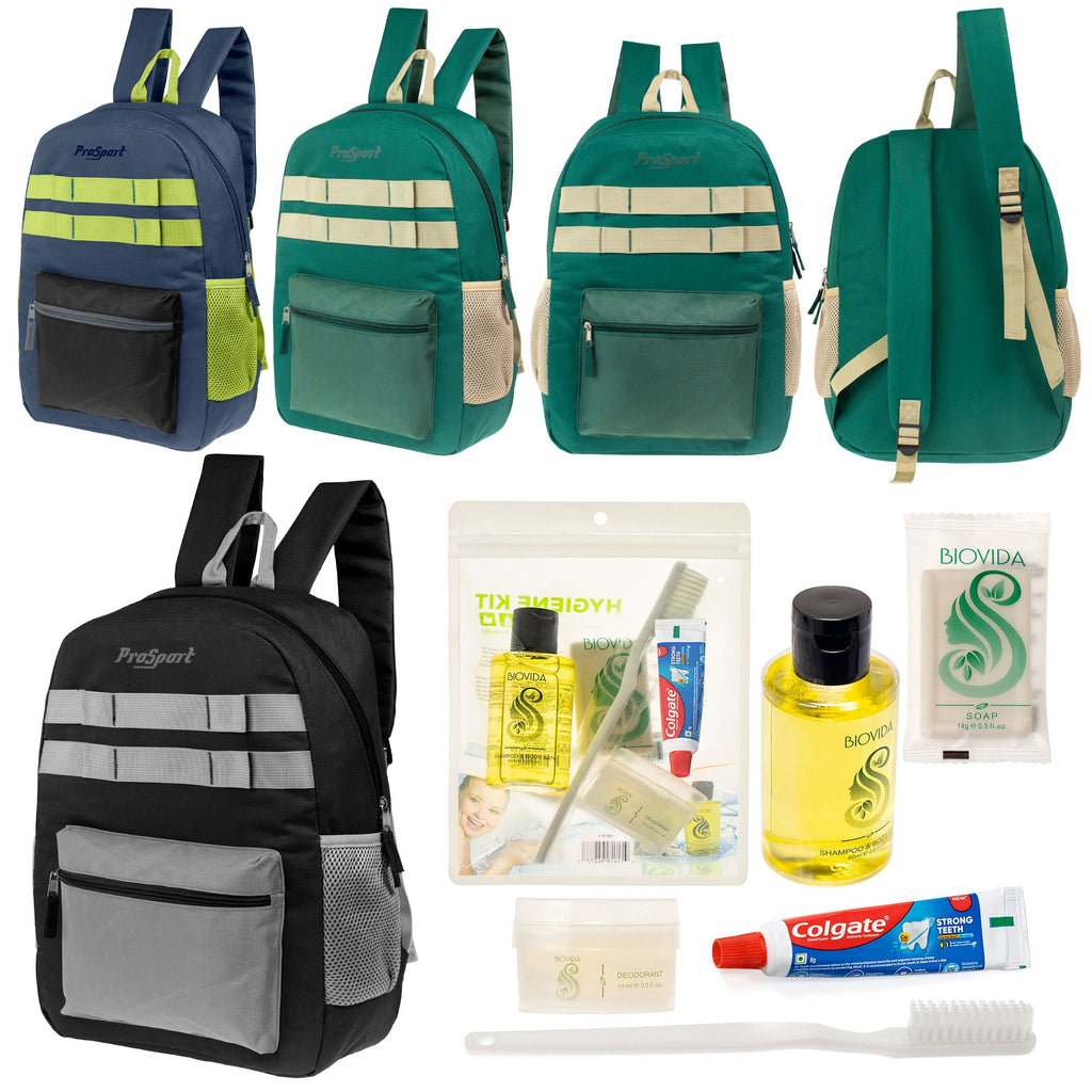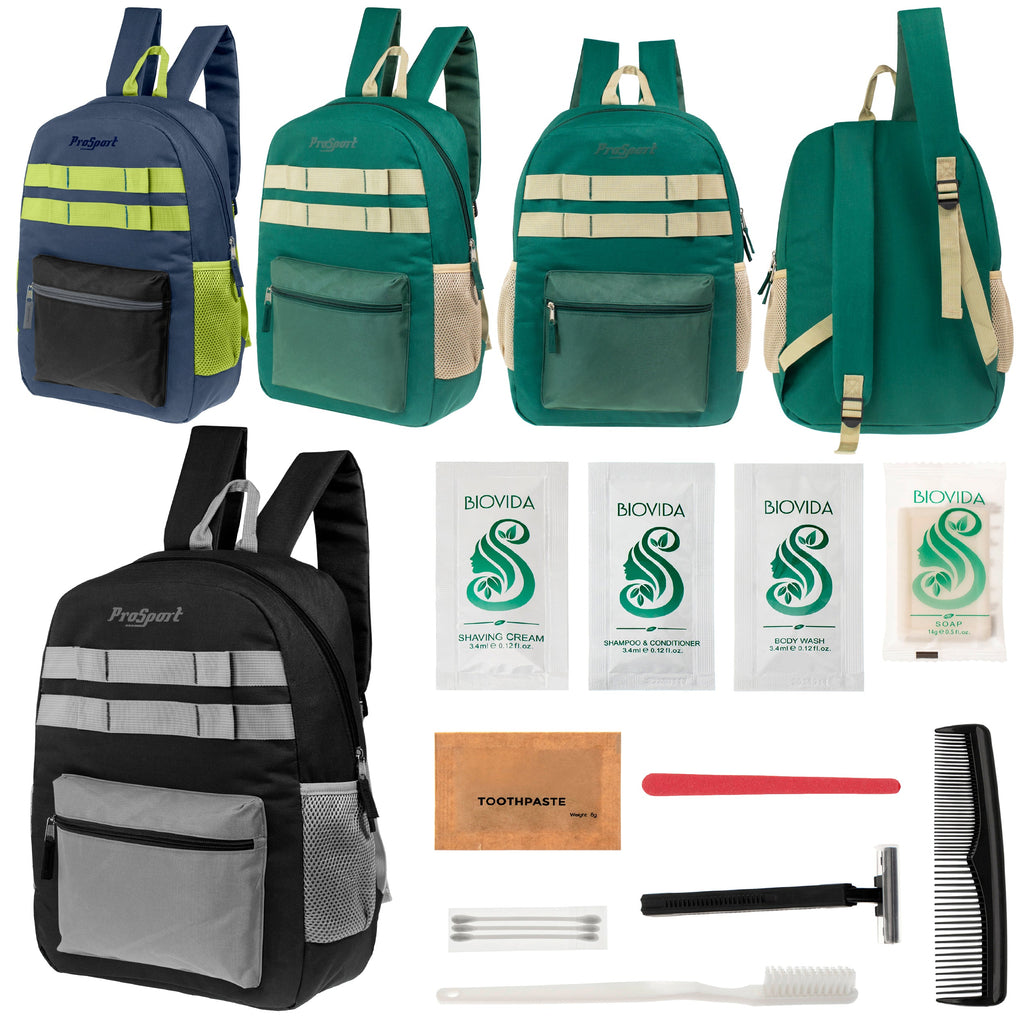 You get wholesale hygiene kits of your choice along with our 17 inch unisex wholesale backpacks in assorted colors in this essential care box for the homeless. The sturdy bulk backpacks come in 3 different color combinations and features dual mesh side pockets along wit, padded and adjustable straps with a large main compartment and front pocket. There are 15 different choice of wholesale hygiene kits to choose from so you can find the one that fits your needs the best. All orders come with free shipping and tiered discount pricing!