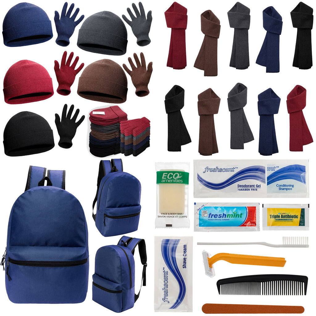 This combo wholesale care package for the homeless features our 17 inch basic backpack in navy blue that is great for both women and men. Get this backpack with your choice of many different hygiene kits and also get warm winter gloves, scarves and beanies. You get 12 of each item making this an excellent purchase for charity donations for the unhoused during the coldest months of the year. Your purchase comes with free shipping and bulk volume discount pricing.