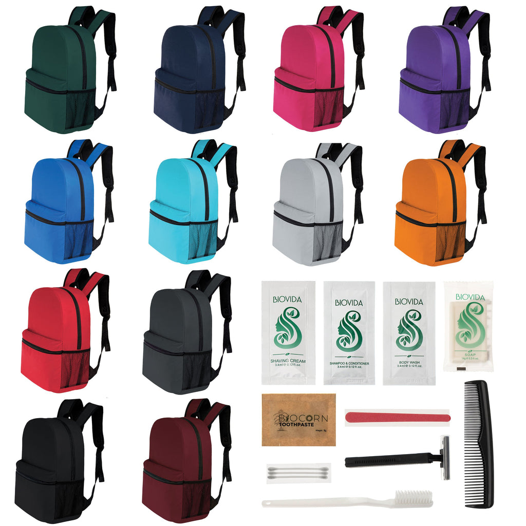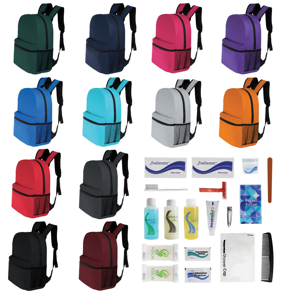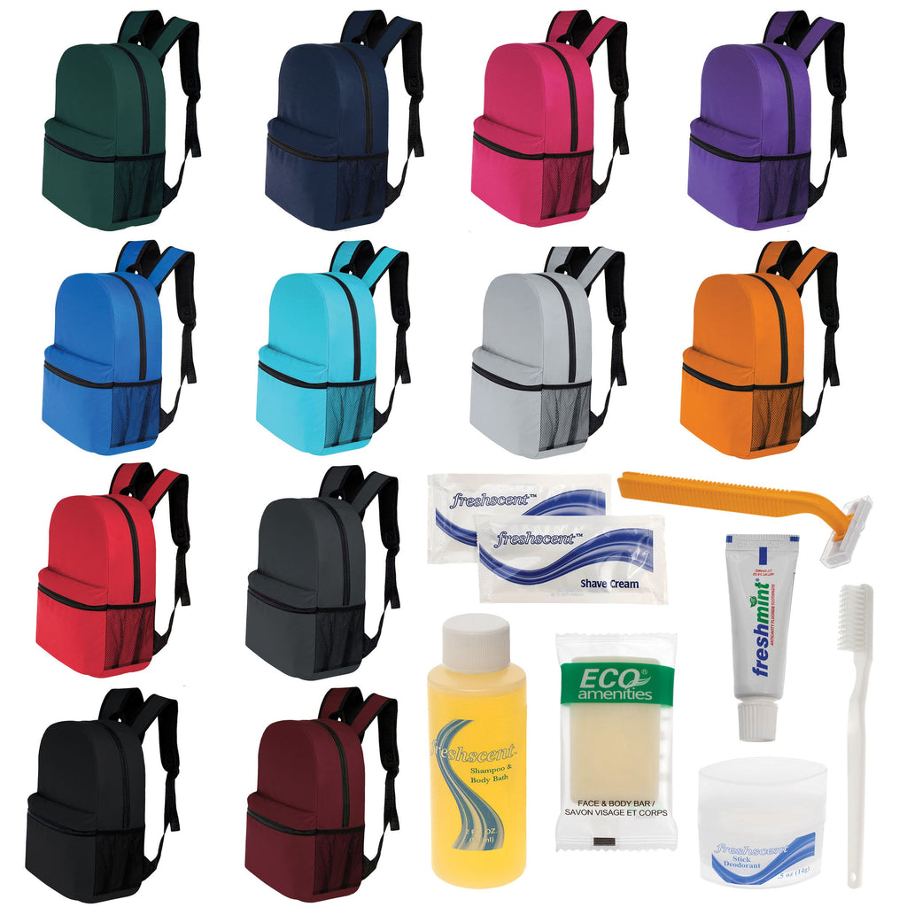 This vital wholesale package for the homeless combines our classic 17" backpacks in 12 assorted solid colors with bulk hygiene kits. The unisex 17 inch wholesale backpacks feature a mesh side pocket, reinforced padded and adjustable straps, a large main compartment and a spacious front pocket. There are many different choices of bulk hygiene kits to choose from so you can find the one that best fits your needs. All of our bulk orders come with free shipping and bulk tiered discount pricing!