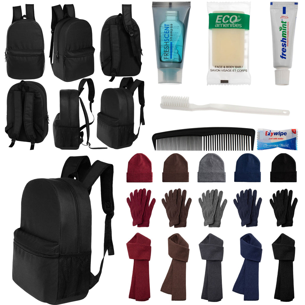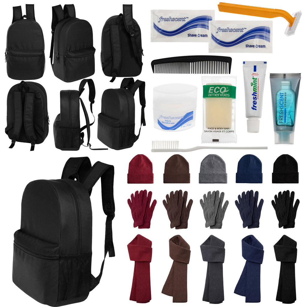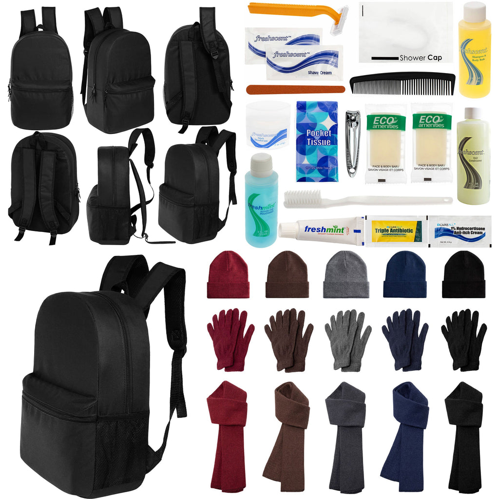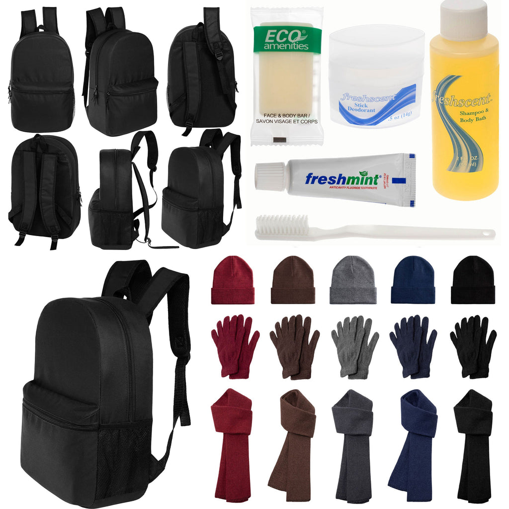 This winter wholesale care box for the homeless features our large capacity unisex 18.5 inch basic backpack in black. This backpack is combined with your choice of many different hygiene kits and also has warm winter gloves, scarves and beanies. You get 12 of each item making this an excellent purchase for charity donations for the unhoused during the coldest months of the year. Enjoy free shipping and bulk volume discount pricing.