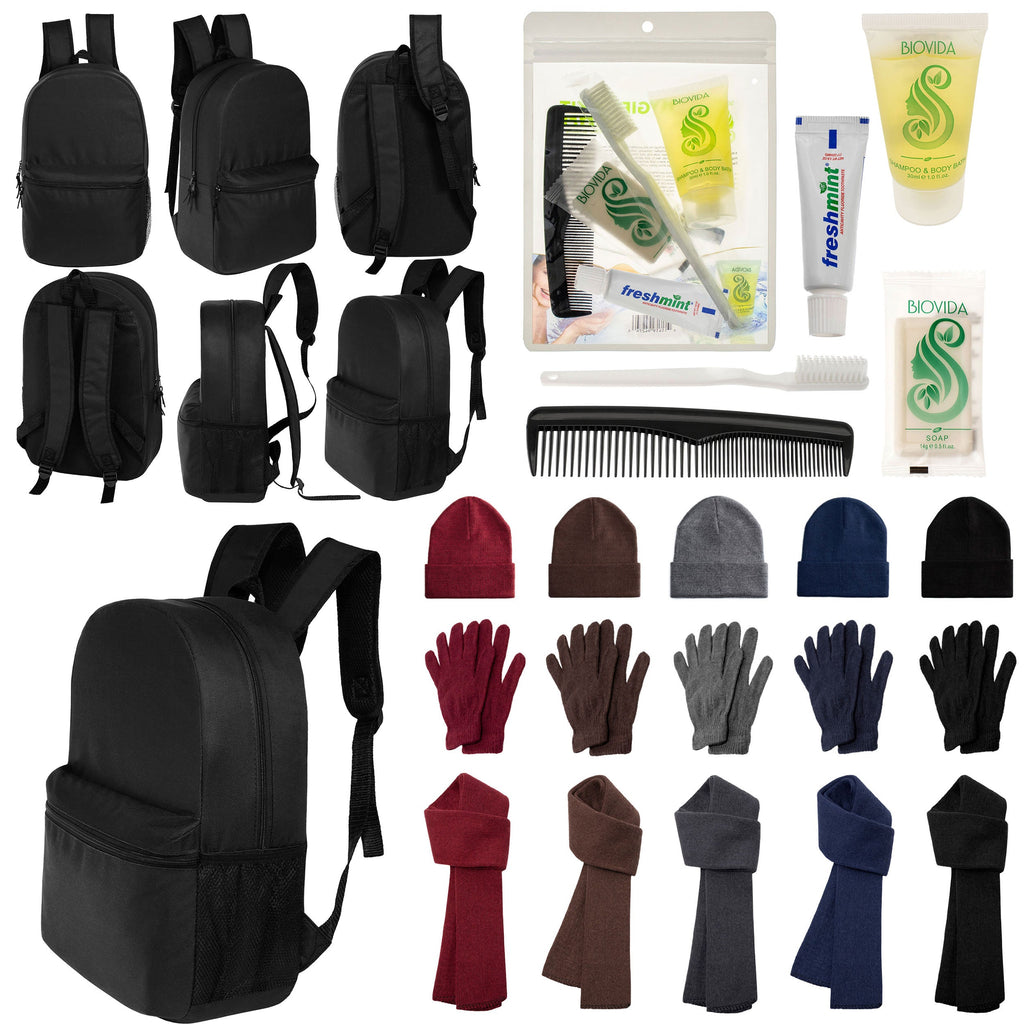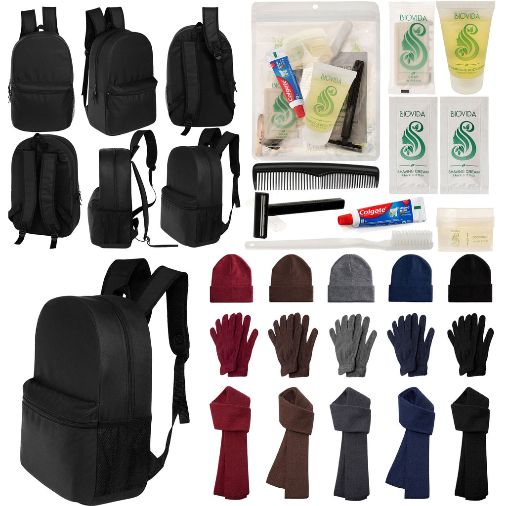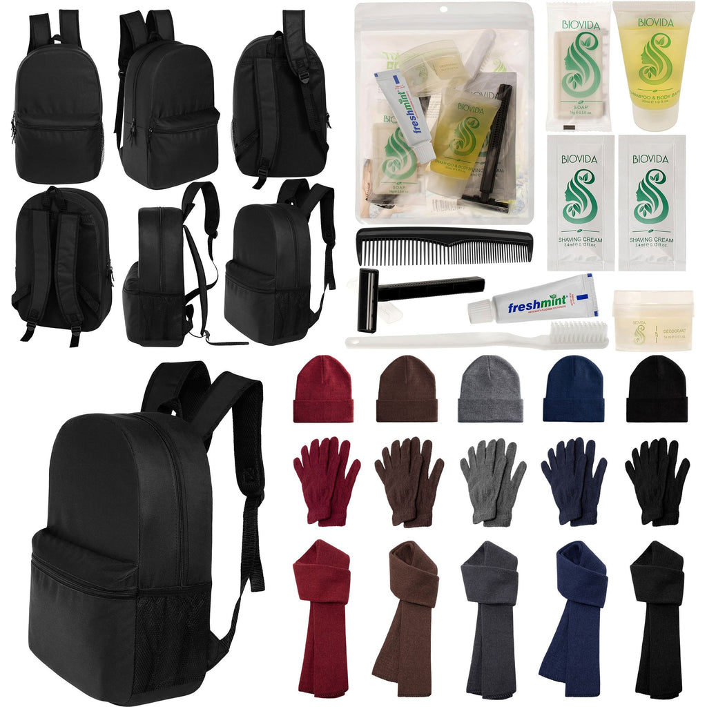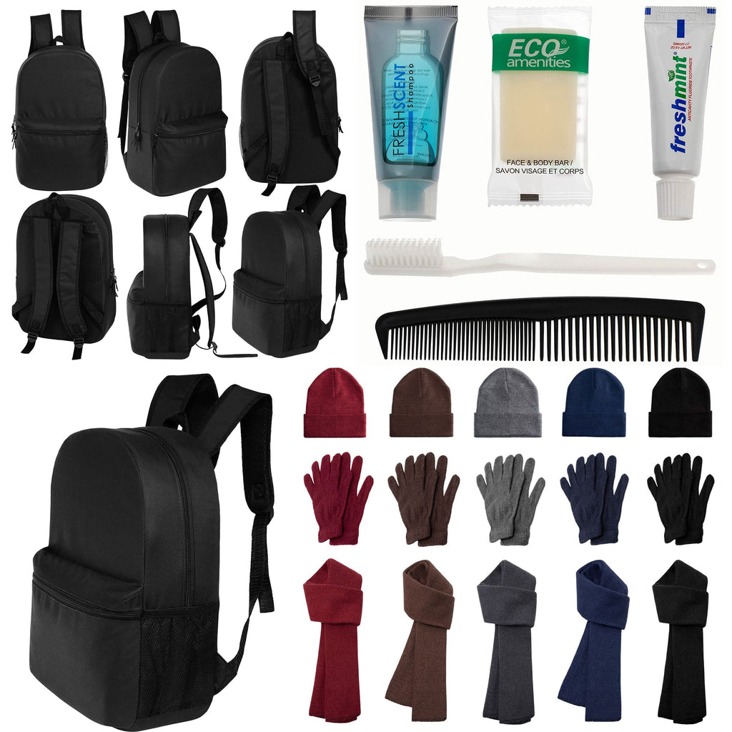 This winter wholesale care box for the homeless features our large capacity unisex 18.5 inch basic backpack in black. This backpack is combined with your choice of many different hygiene kits and also has warm winter gloves, scarves and beanies. You get 12 of each item making this an excellent purchase for charity donations for the unhoused during the coldest months of the year. Enjoy free shipping and bulk volume discount pricing.