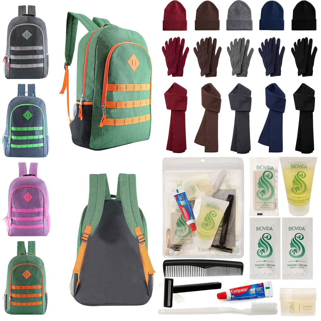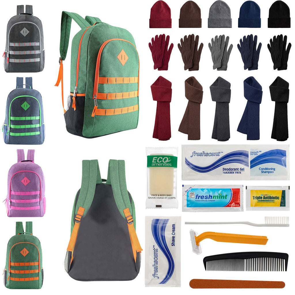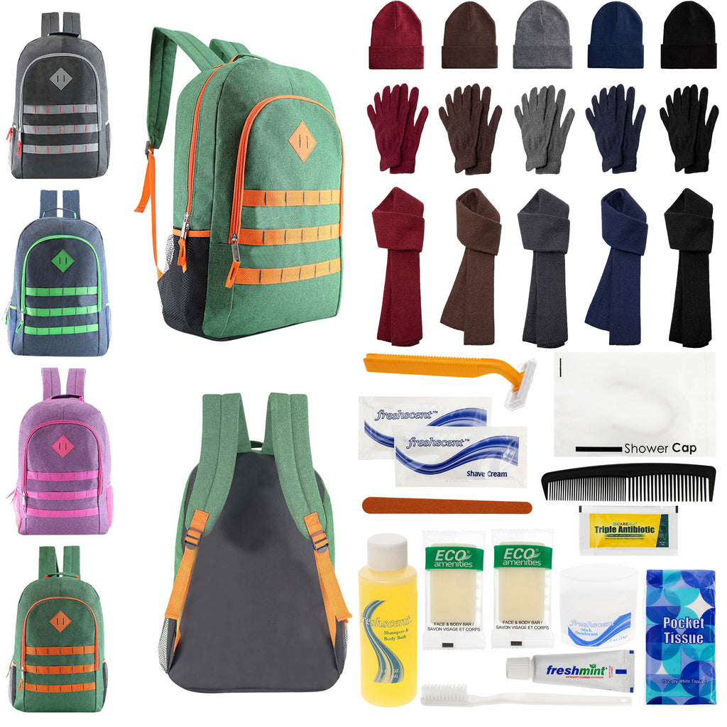 You get 12 deluxe 19 inch backpacks featuring 2 mesh side pockets and 2 large storage compartments along with 12 hygiene kits and 12 each of gloves, scarves and hats. This wholesale winter care package is essential for the homeless community during the coldest months of the year. This bulk package comes with discount volume pricing and free shipping.
