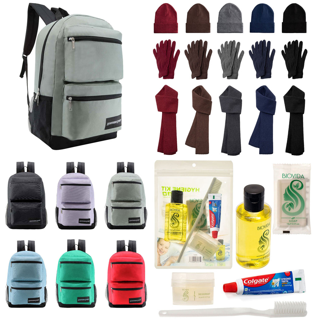 You get 12 premium large 19 inch backpacks featuring 2 mesh side pockets and 2 large front storage compartments as well as a spacious main compartment along with 12 hygiene kits and 12 each of gloves, scarves and hats. This wholesale winter care package is essential for the homeless community during the coldest months of the year. This bulk box comes with discount volume pricing and free shipping and is perfect for charity donations.