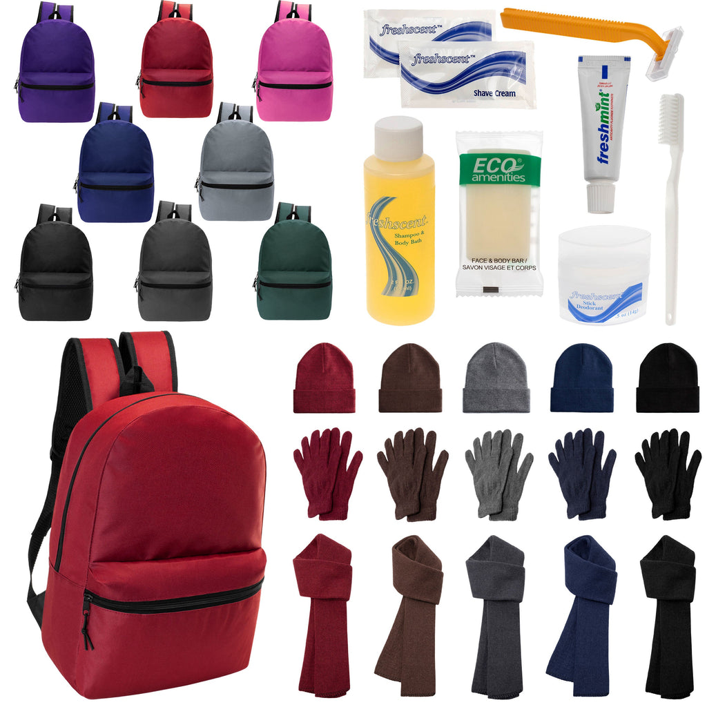 This combination wholesale care box for the homeless features our unisex 17 inch basic backpack shipped with 8 assorted colors. This backpack is combined with your choice of many different hygiene kits and also comes with warm winter gloves, scarves and beanies. You get 12 of each item making this an excellent purchase for charity donations for the homeless during the coldest months of the year. Enjoy free shipping and bulk volume discount pricing.